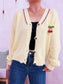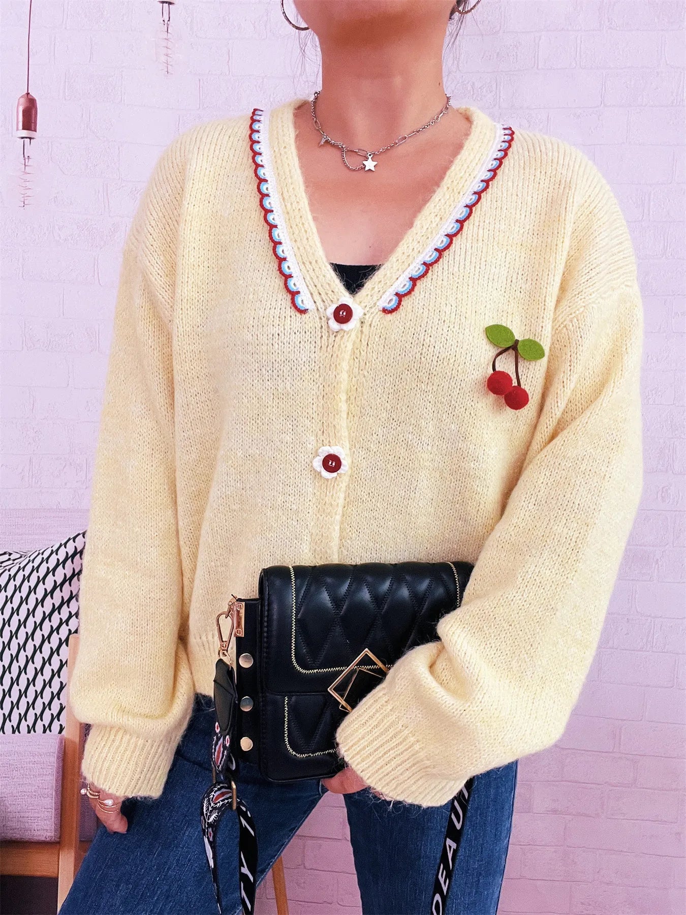 Sweet and playful, this knit cardigan features embroidered cherries and contrast trim for a vintage-inspired touch. Its relaxed fit and soft knit make it perfect for layering over tanks or tees. A charming pick for cozy days with a hint of whimsy.