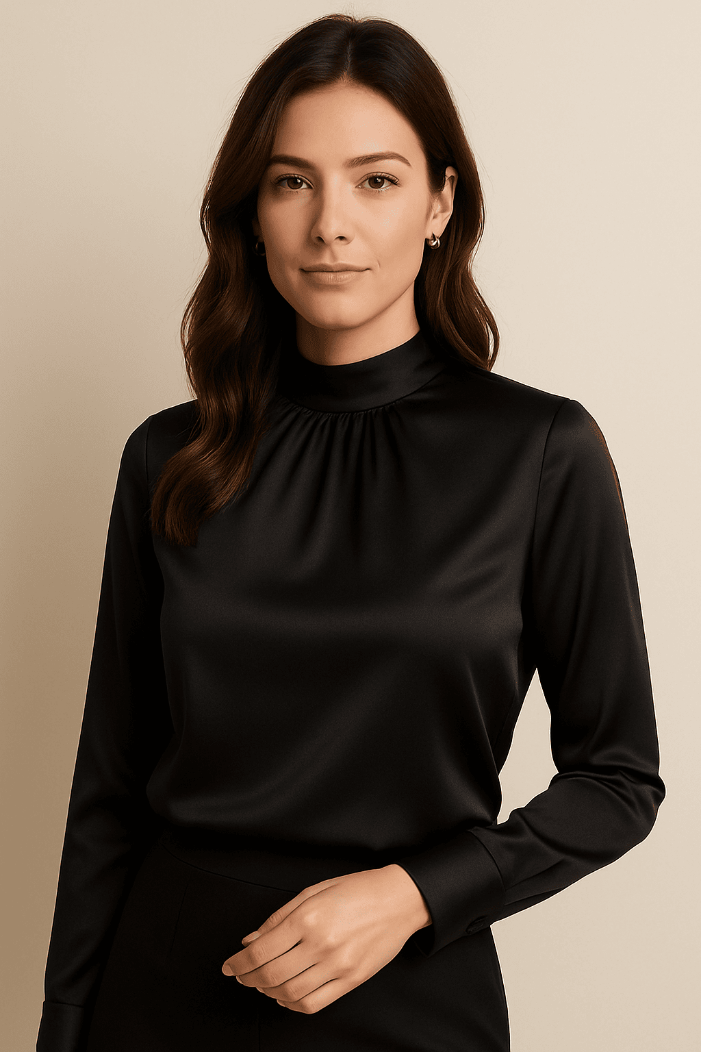 Timeless elegance meets modern draping in this fluid satin blouse The neckline highlights your shoulders while the full-length design creates a graceful, statuesque look. Perfect for weddings, holiday formals, and black-tie celebrations.