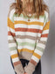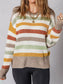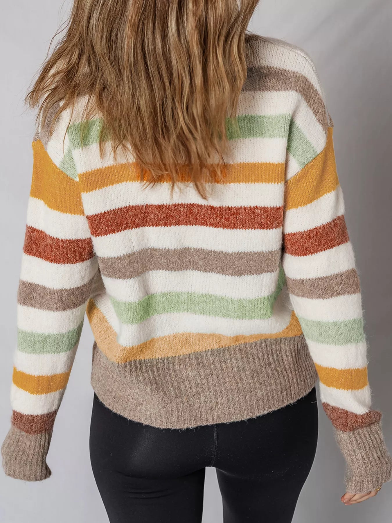 Cozy yet chic, this striped sweater blends warm autumn tones with a relaxed fit that layers beautifully over your favorite denim. Its soft knit and timeless stripe pattern make it a versatile piece for coffee dates, errands, or evenings by the fire. A go-to essential that adds both comfort and charm to your everyday look.