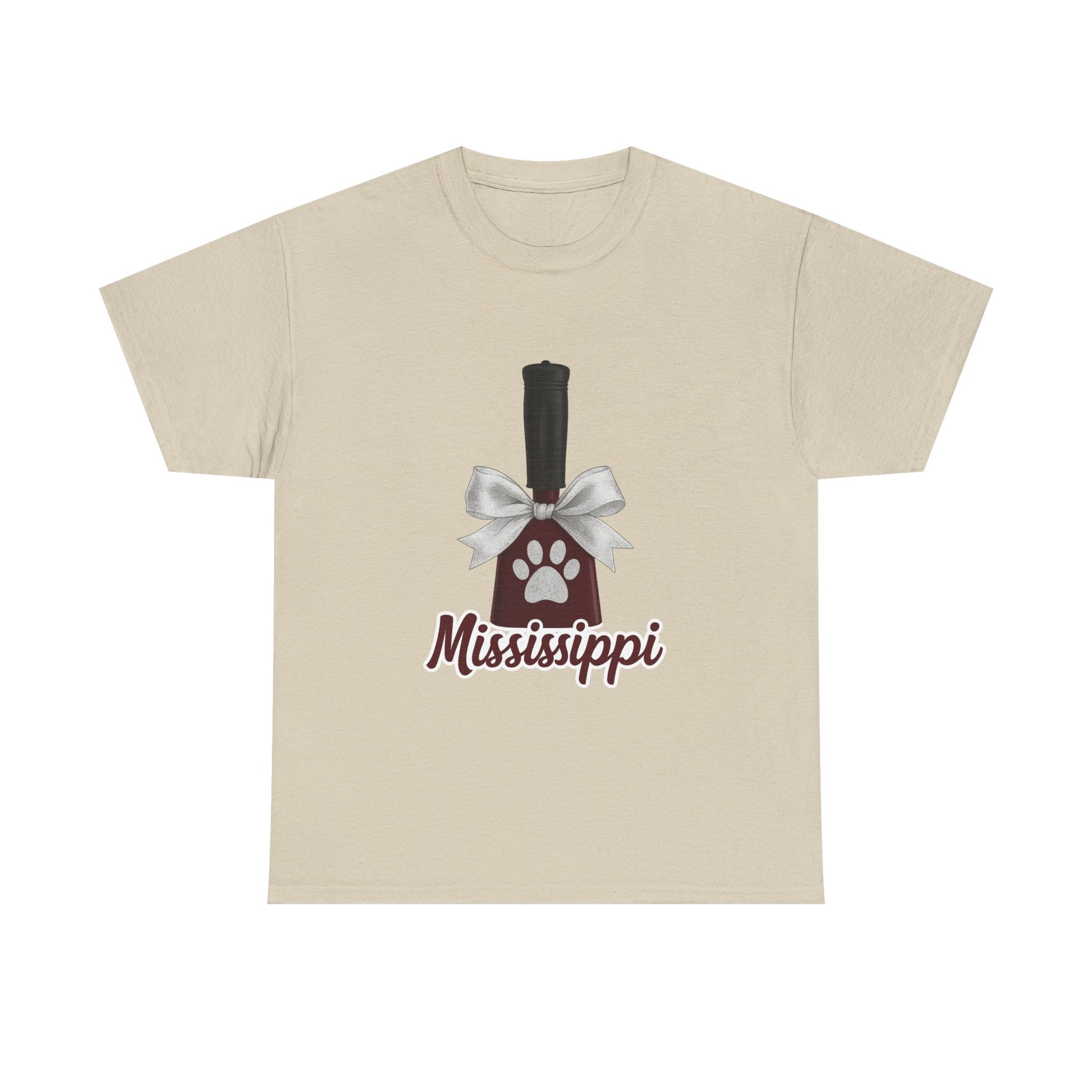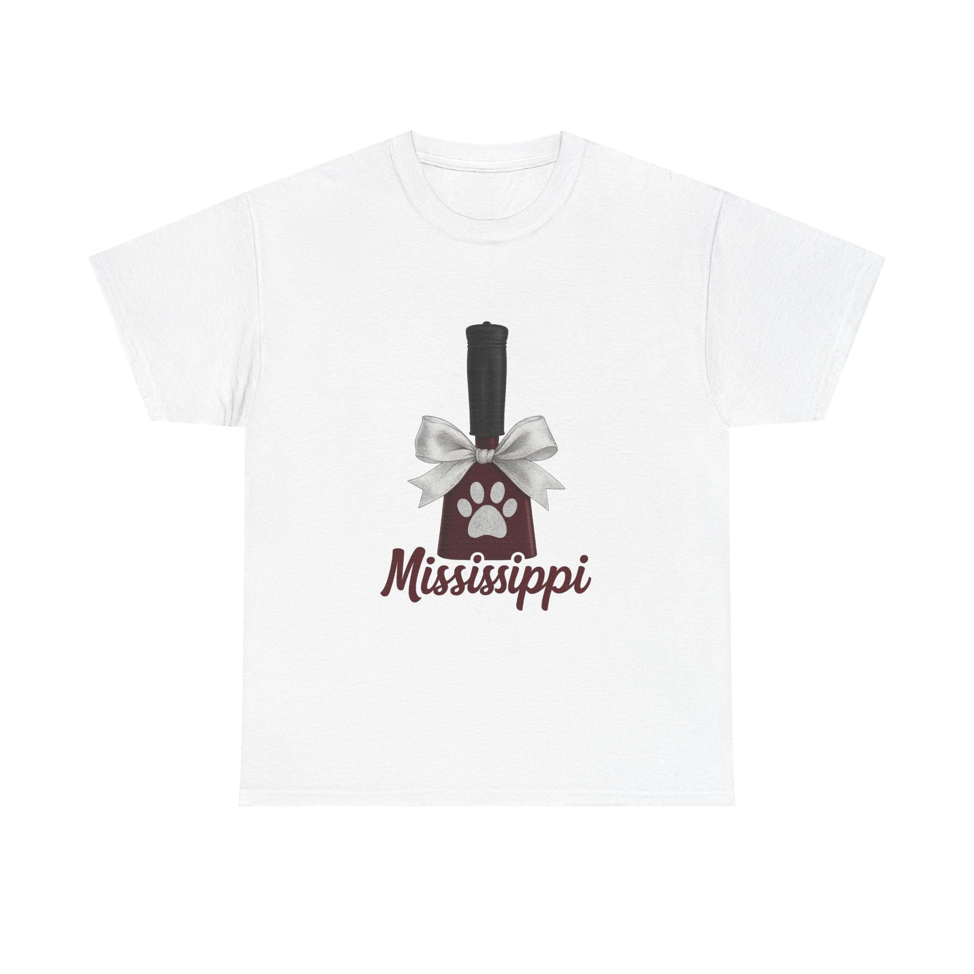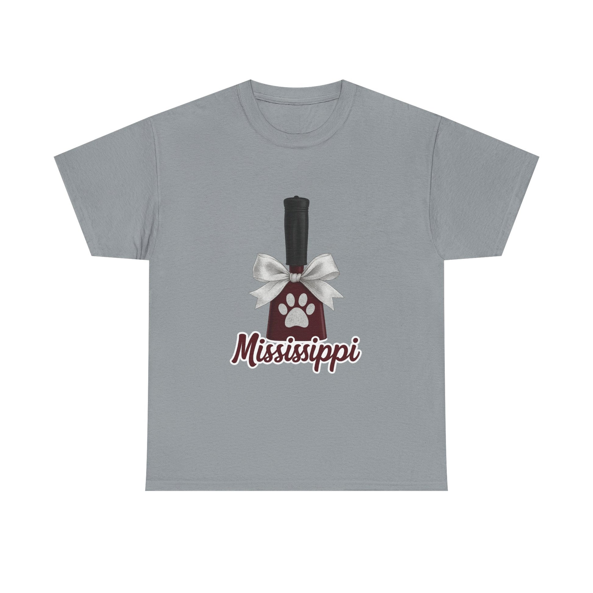Ring in that southern pride with this playful cowbell design, dressed up in maroon and topped with a sparkling silver bow. A bold white paw print adds a fierce gameday touch, while “Mississippi” in retro script brings the boutique charm. Whether you're cheering from the stands or tailgating with your crew, this tee delivers the perfect blend of sass and spirit. Just add jeans and a smile — cowbell optional.
