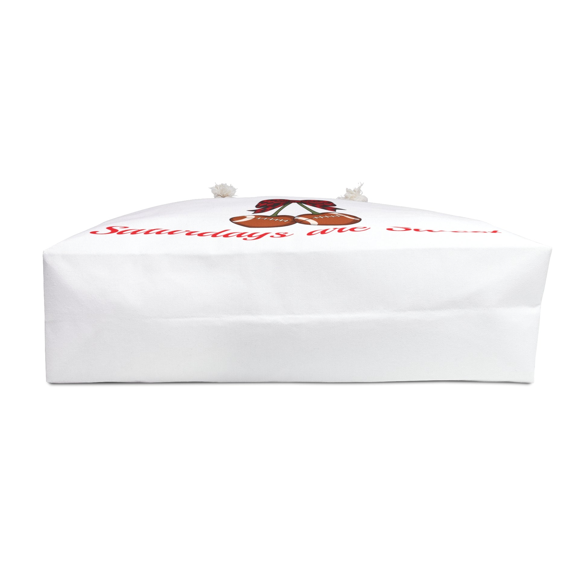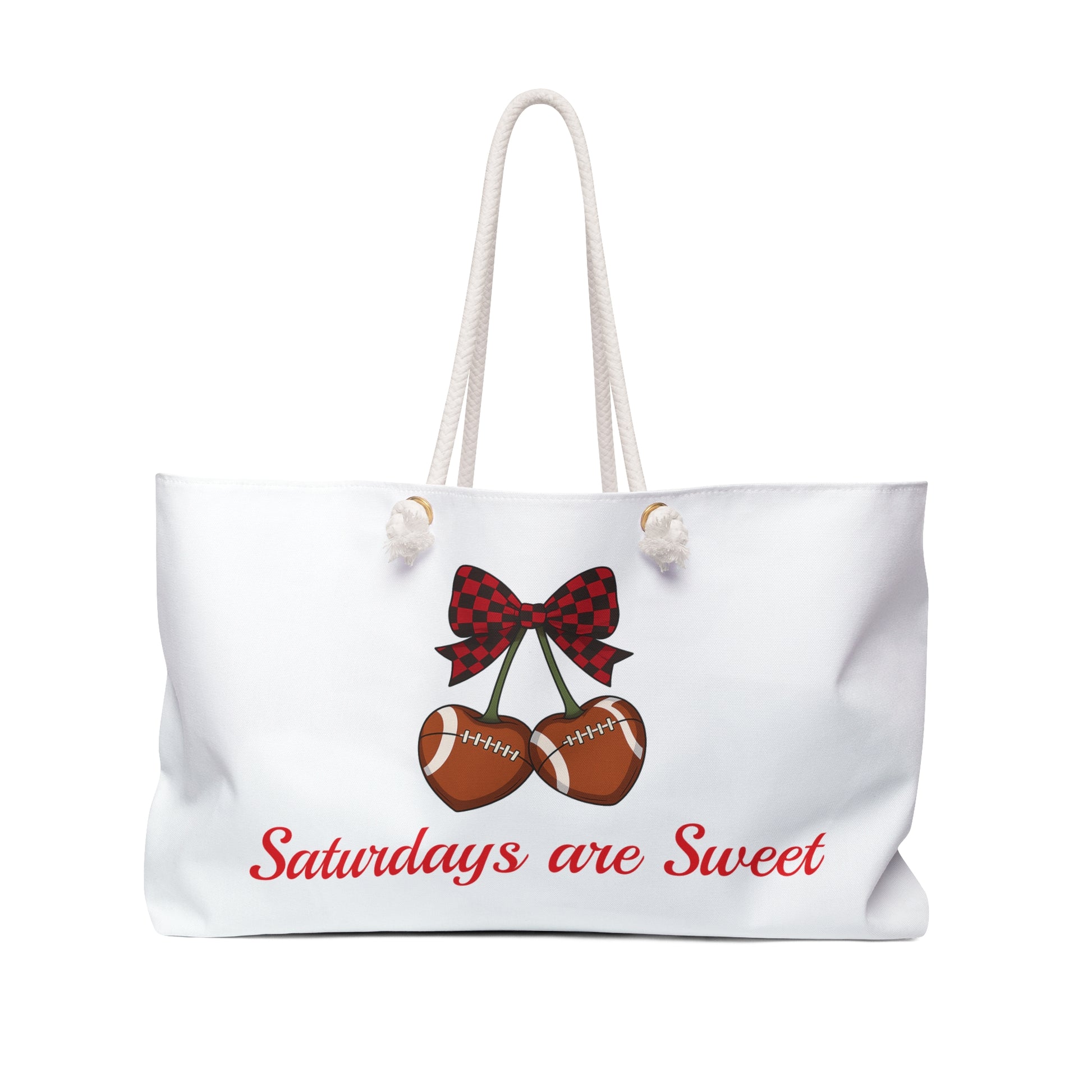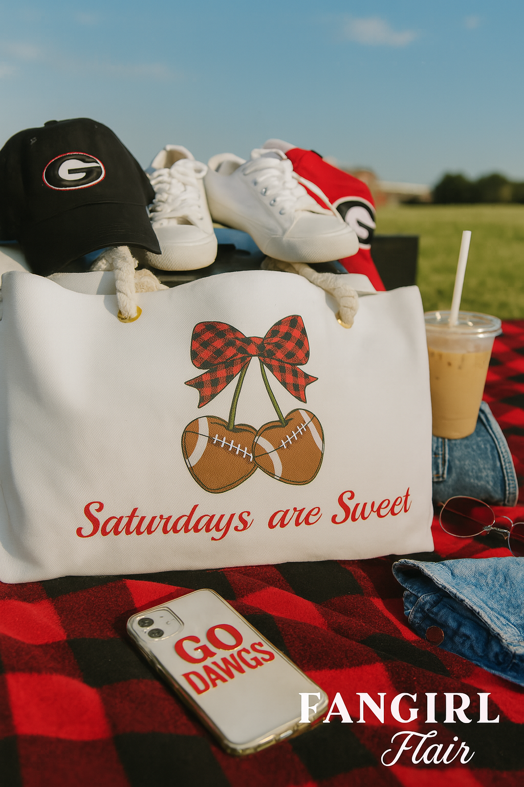 Sweet tea, red bows, and a whole lot of Dawg pride — the Saturdays Are Sweet Weekender is made for Georgia fangirls who bring style to every stadium. Featuring a bold red-and-black checkered bow with cherry-style footballs and boutique script across the bottom, this oversized tote is ready for tailgates, overnights, and every moment in between.